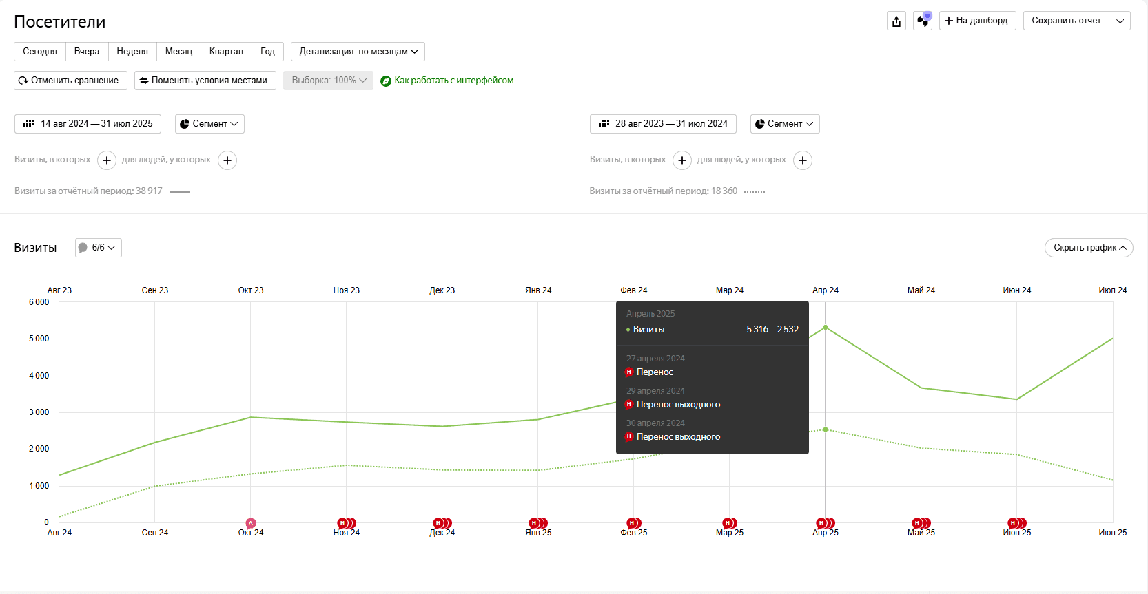 Видим как 2024 и 2025 год имеют общую динамику, но в июле 2025 вместо снижения трафик, наоборот, идет резко вверх.